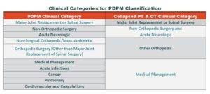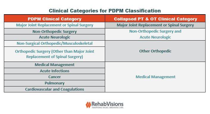 The clinical reason for Skilled Nursing Facility (SNF) stay (MDS item I0020B) is used to assign the resident into one of 10 clinical categories. These 10 categories are collapsed into four PT and OT clinical category groups. If the PDPM clinical category mapping indicates that this primary diagnosis is eligible for one of the surgical categories, then evaluate further which of these PT/OT Clinical Categories is appropriate. Refer to J2100 to determine if a major joint replacement, spinal surgery or other orthopedic surgery occurred during the prior inpatient stay. If the patient has procedure(s) listed in J2100-J2420 coded, then the patient is categorized into the major joint replacement or spinal surgery clinical category. If any of the procedures indicated in items J2500, J2510, J2520, or J2530 were performed, then the patient is categorized into the Orthopedic Surgery category.