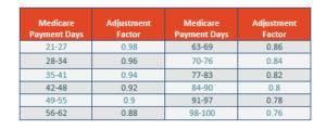 Research by CMS determined that resource utilization for both PT and OT was higher at the beginning of the SNF stay, declining over the course of the admission. To help ensure that resource allocation aligned with actual costs, the PT and OT components were given variable per-diem adjustments. To apply this factor, the case-mix adjusted per diem rates for both PT and OT are multiplied by the relevant indices to obtain the adjusted per diem. There is no adjustment factor for days one through twenty of the Medicare stay. Please see the chart below to determine the adjustment factor for subsequent days: